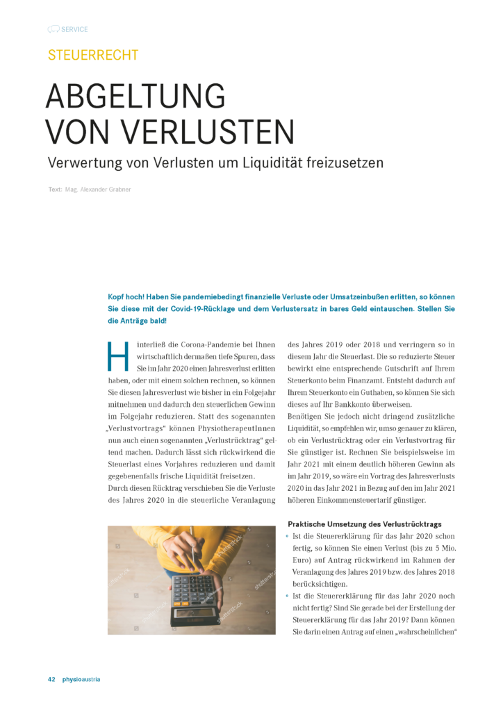 „Verlustvortrags“ können PhysiotherapeutInnen nun auch einen sogenannten „Verlustrücktrag“ geltend machen. Dadurch lässt sich rückwirkend die Steuerlast eines Vorjahres reduzieren und damit gegebenenfalls frische Liquidität freisetzen. Durch diesen Rücktrag verschieben Sie die Verluste des Jahres 2020 in die steuerliche Veranlagung des Jahres 2019 oder 2018 und verringern so in diesem Jahr die Steuerlast. Die so reduzierte Steuer
