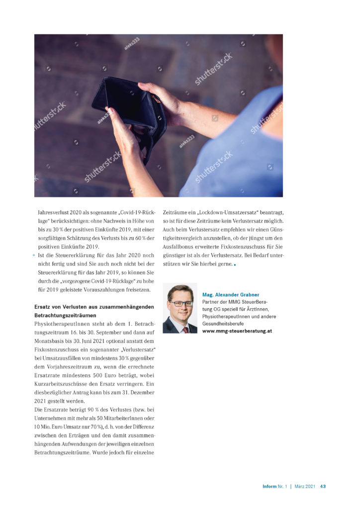PhysiotherapeutInnen steht ab dem 1. Betrachtungszeitraum 16. bis 30. September und dann auf Monatsbasis bis 30. Juni 2021 optional anstatt dem Fixkostenzuschuss ein sogenannter „Verlustersatz“ bei Umsatzausfällen von mindestens 30 % gegenüber dem Vorjahreszeitraum zu, wenn die errechnete Ersatzrate mindestens 500 Euro beträgt, wobei Kurzarbeitszuschüsse den Ersatz verringern. Ein diesbezüglicher Antrag kann bis zum 31. Dezember 2021 gestellt werden.