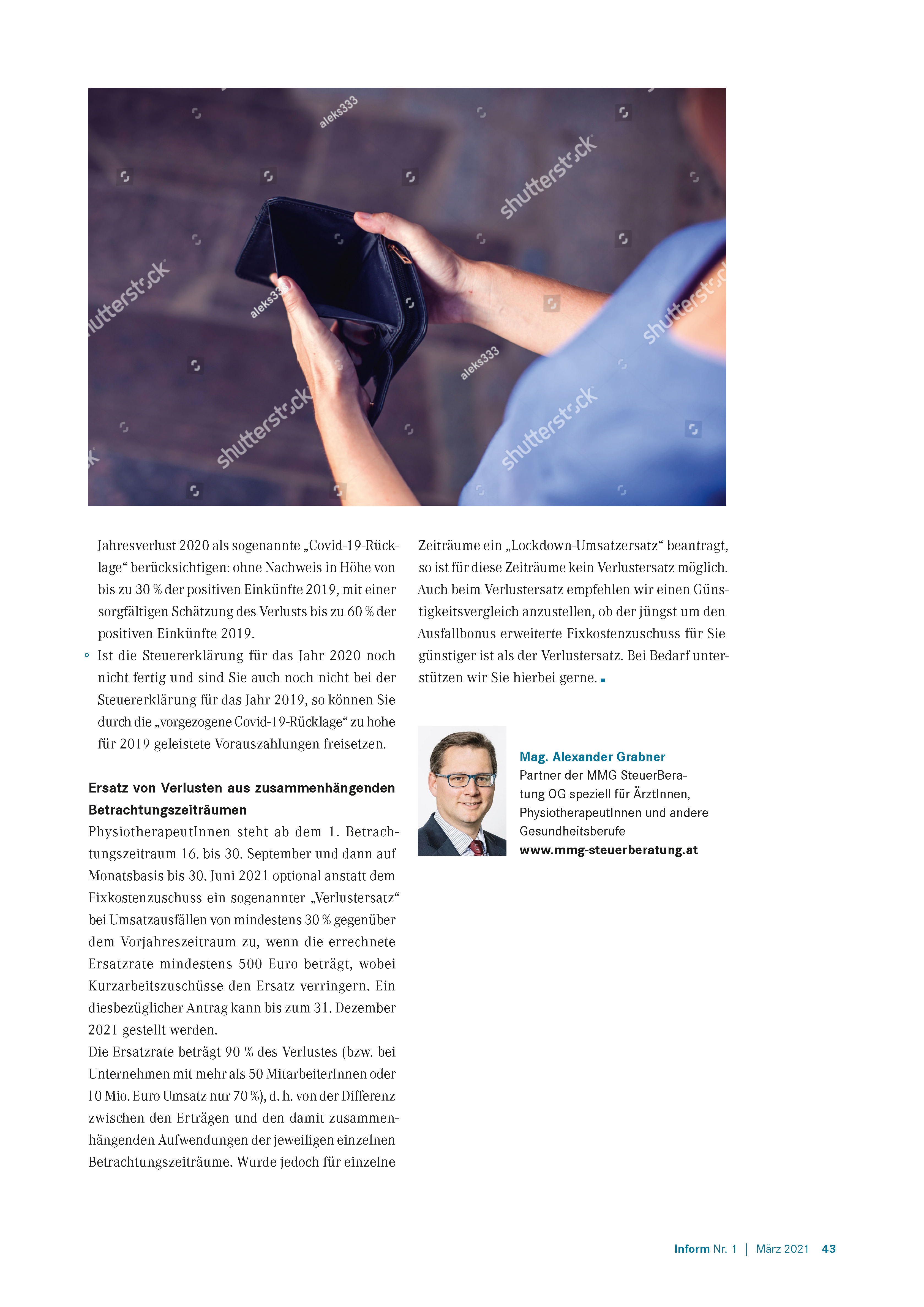 PhysiotherapeutInnen steht ab dem 1. Betrachtungszeitraum 16. bis 30. September und dann auf Monatsbasis bis 30. Juni 2021 optional anstatt dem Fixkostenzuschuss ein sogenannter „Verlustersatz“ bei Umsatzausfällen von mindestens 30 % gegenüber dem Vorjahreszeitraum zu, wenn die errechnete Ersatzrate mindestens 500 Euro beträgt, wobei Kurzarbeitszuschüsse den Ersatz verringern. Ein diesbezüglicher Antrag kann bis zum 31. Dezember 2021 gestellt werden.