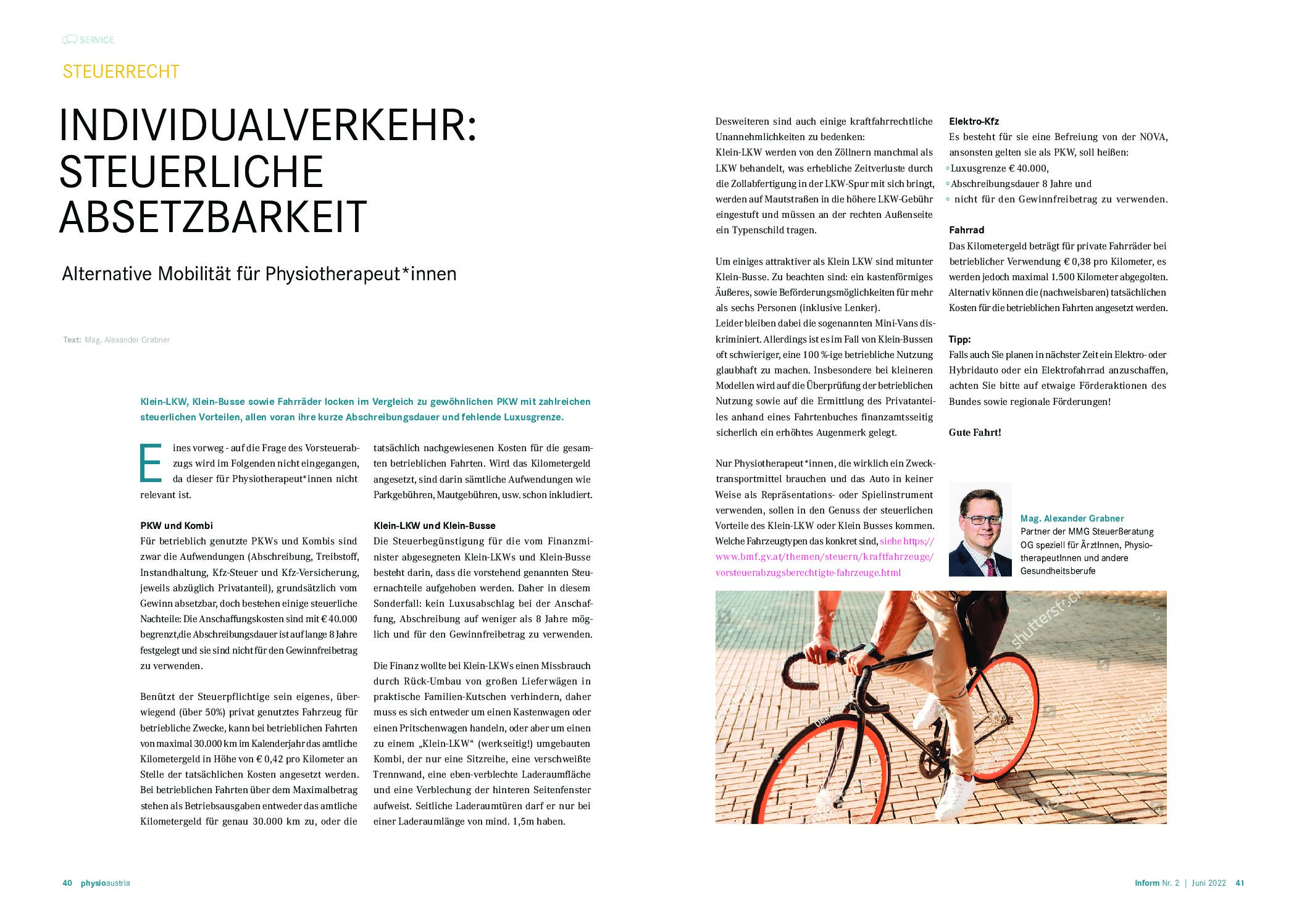Im Vorjahr wurden rund vierzehn Steuergesetze bzw Verordnungen veröffentlicht, bei denen auch interessante Neuerungen betreffend steuerlich abzugsfähige Betriebsausgaben und die Umsatzsteuer dabei waren Nachfolgend sollen für Physiotherapeut*innen relevante Neuerungen betreffend abzugsfähige Kilometergelder und betreffend Kleinunternehmer beleuchtet werden: Kleinunternehmer Die steuerliche Einstufung als sogenannter „Kleinunternehmer“ hat sowohl bei...