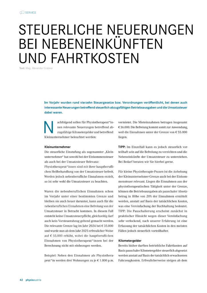 Nachfolgend sollen für Physiotherapeut*innen relevante Neuerungen betreffend abzugsfähige Kilometergelder und betreffend Kleinunternehmer beleuchtet werden:
