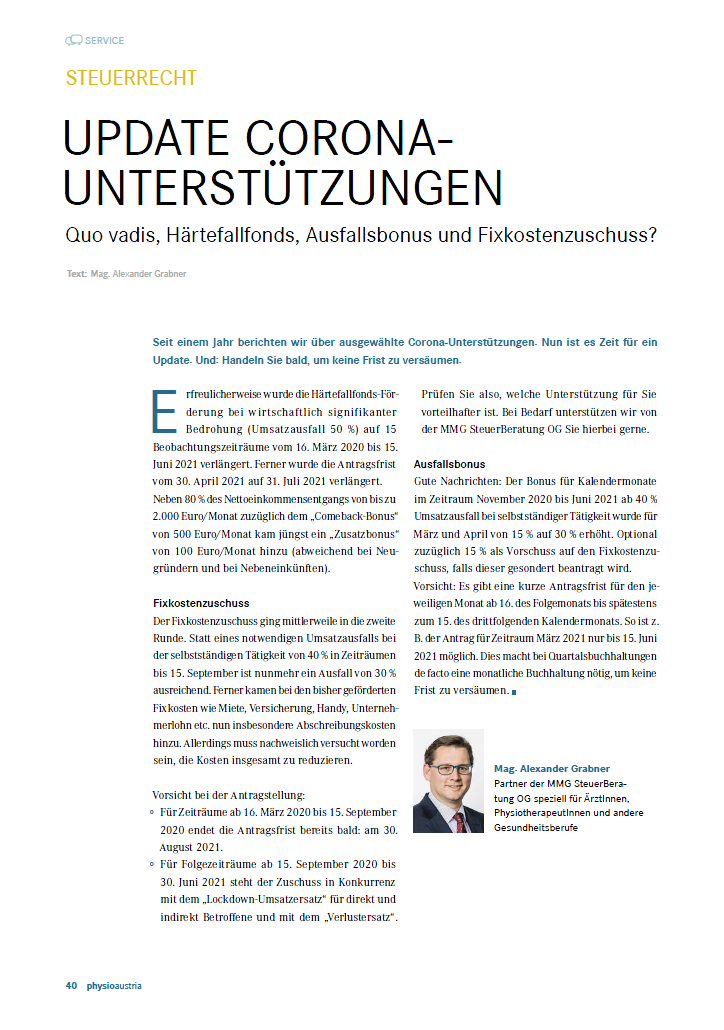 Seit einem Jahr berichten wir über ausgewählte Corona-Unterstützungen. Nun ist es Zeit für ein Update. Und: Handeln Sie bald um keine Frist zu versäumen.